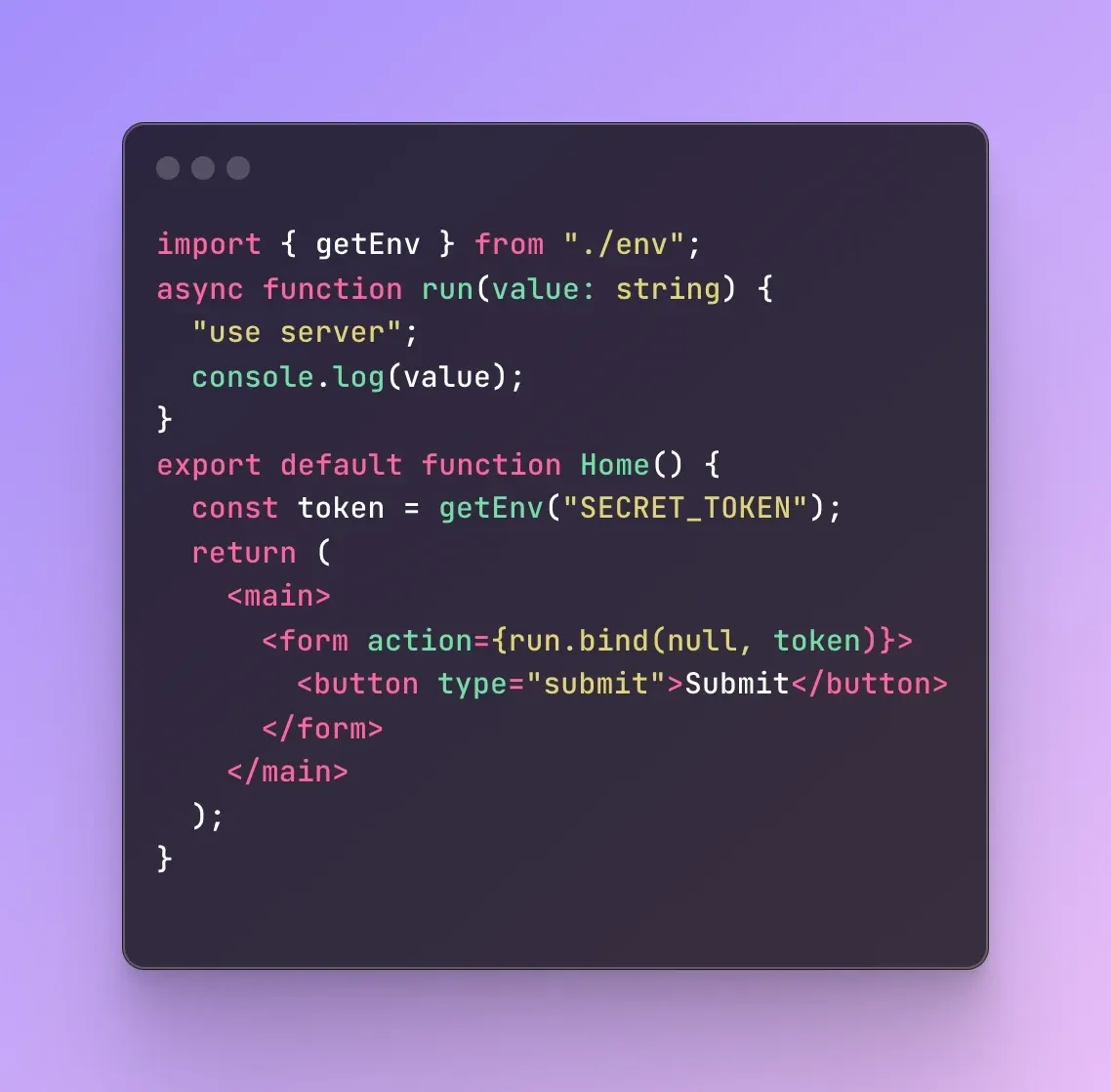 The above code is a simple form component using RSC. The logic is to get an environment variable called SECRET_TOKENvia the getEnv function, pass it to the run function, and run it on the server.