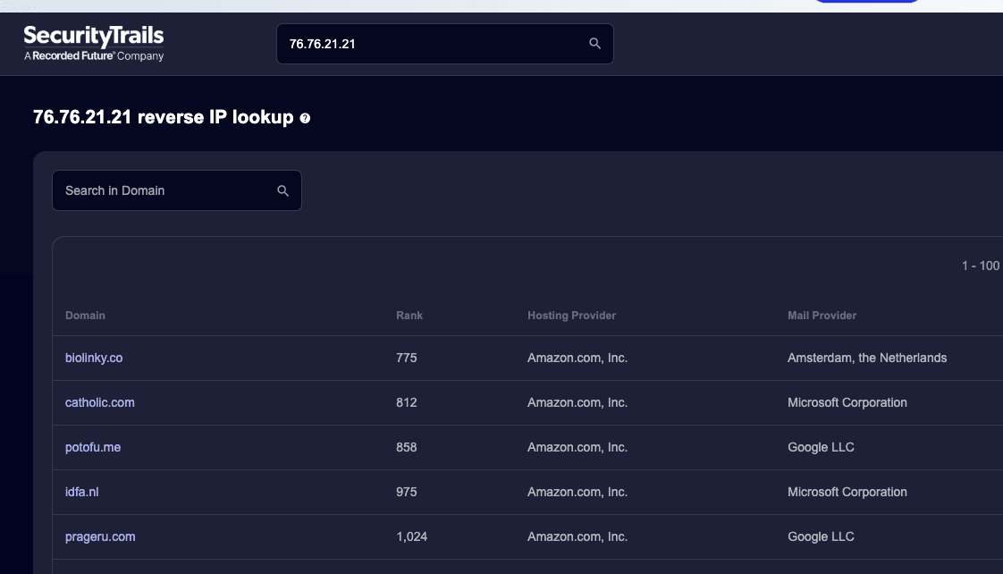 Platforms like Vercel extensively use shared infrastructure such as Anycast IP addresses, making it difficult to find specific websites or a complete list of hosted sites. For example, Vercel's representative IP address 76.76.21.21 can host hundreds of thousands of domains. Complex DNS routing and IP address allocation are managed internally by the platform, making identification difficult with only single IP information.