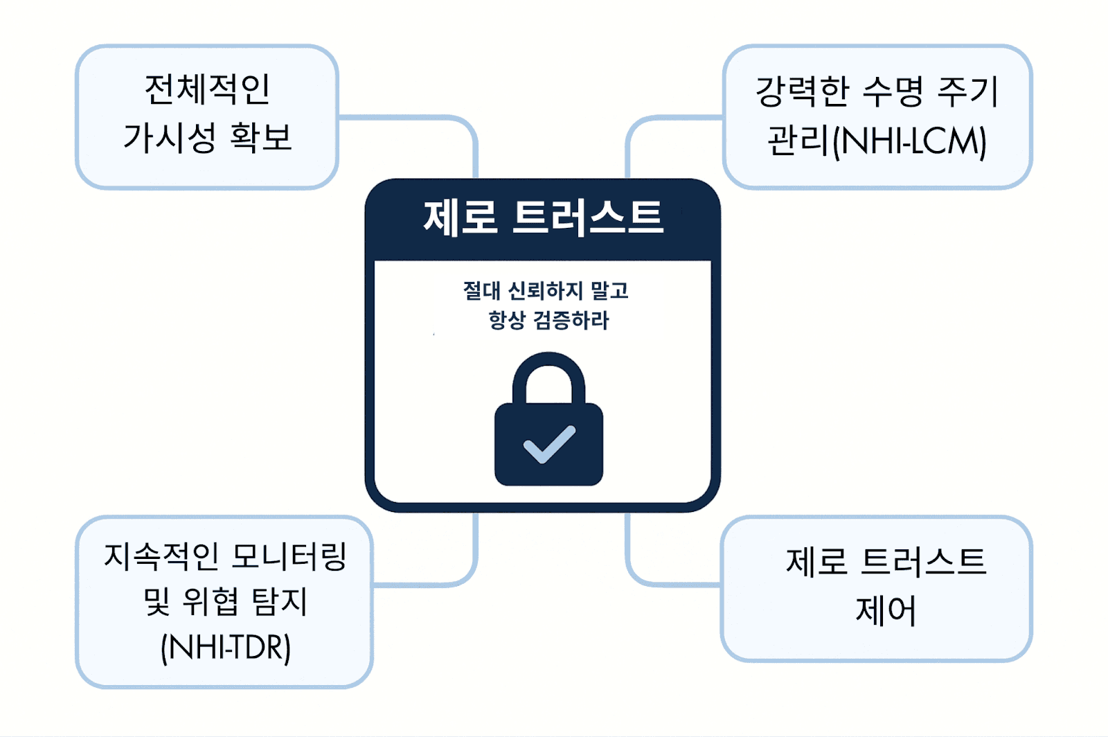 - 강력한 수명 주기 관리(NHI-LCM): 프로비저닝, 권한 관리, 시기적절한 해체를 위한 프로세스 구현.
