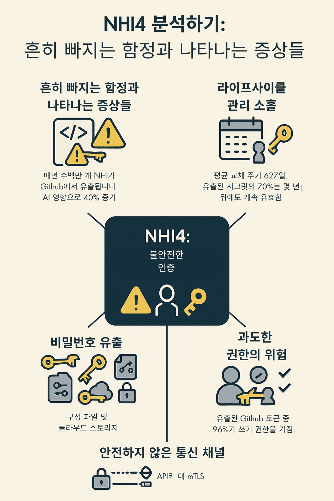 - NHI 자격 증명의 생성, 저장, 사용, 교체, 폐기(오프보딩) 전 과정에 대한 적절한 관리가 이루어지지 않으면 심각한 보안 문제가 발생할 수 있습니다.